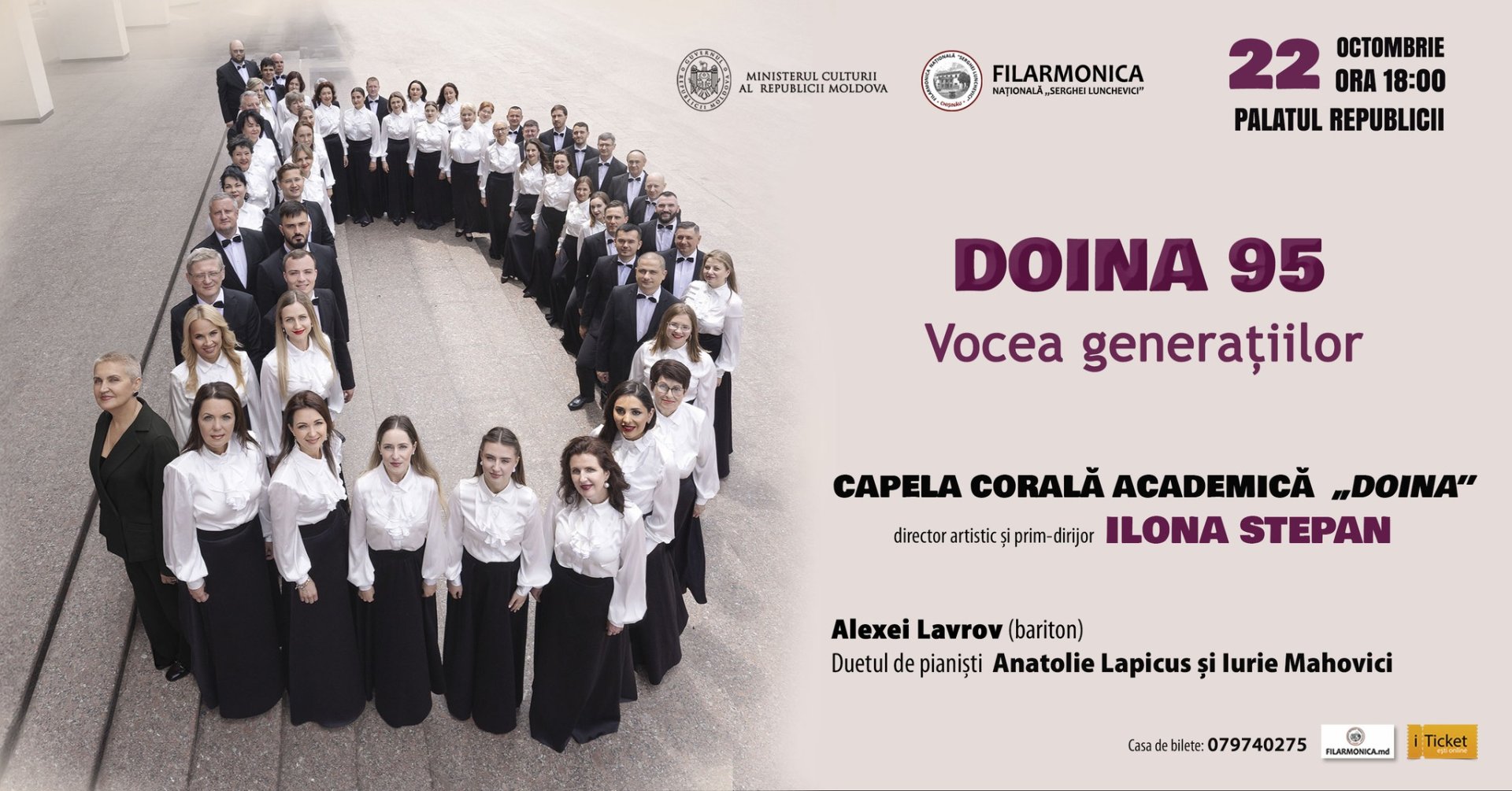 Concertul aniversar „Vocea Generațiilor” va avea loc în sala Filarmonicii Naționale „Serghei Lunchevici”, oferind publicului o ocazie rară de a trăi o experiență sonoră de excepție, în semn de recunoștință pentru cei 95 de ani de istorie, tradiție și excelență artistică ai Capelei Corale Academice „Doina”.