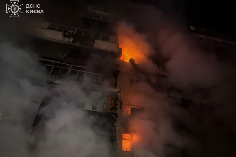 Șeful Administrației Militare a orașului Kiev, Tymur Tkacenko, a declarat că o clădire rezidențială cu 16 etaje a fost lovită în districtul Desnianskyi, provocând un incendiu.