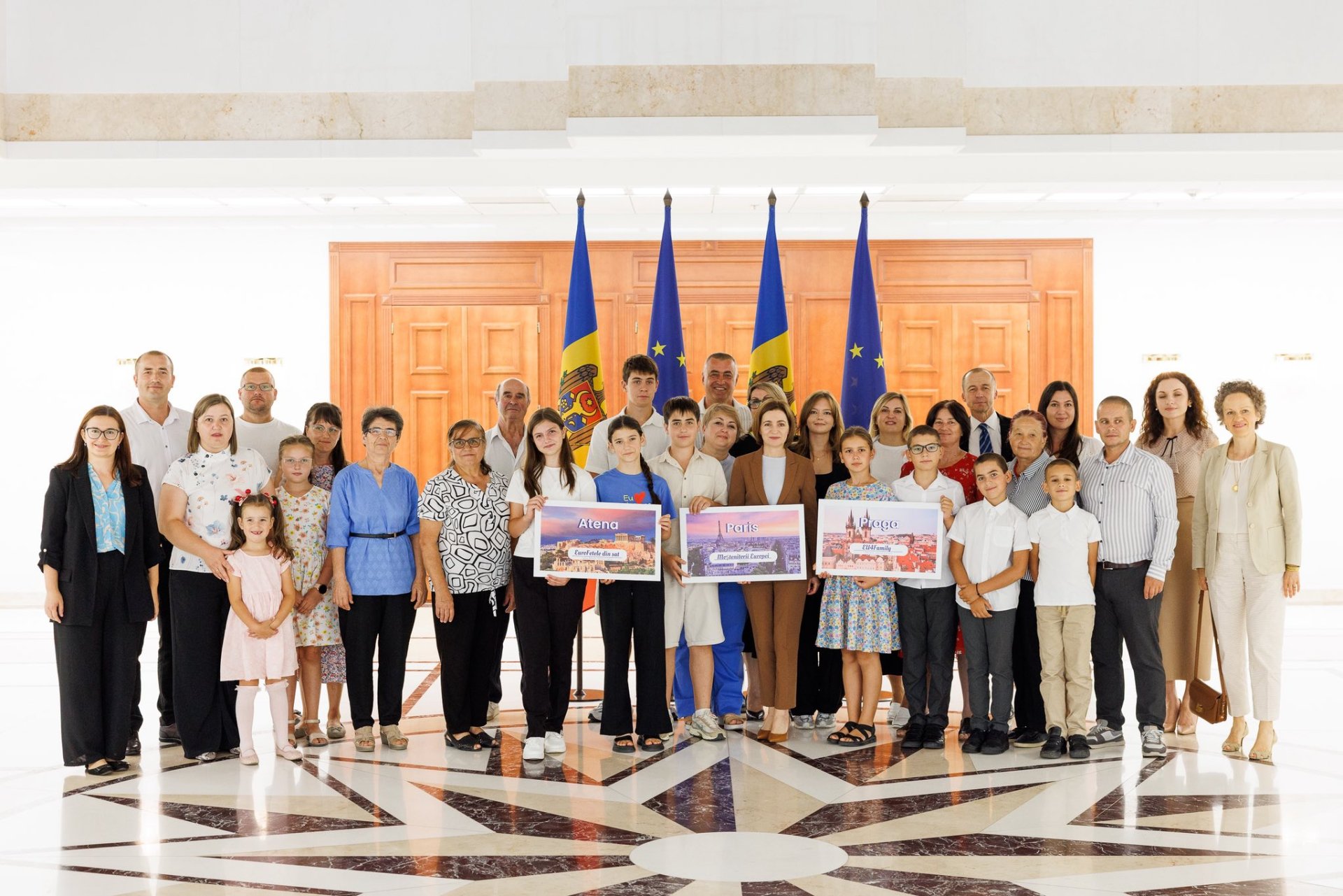 Cele trei echipe câștigătoare ale concursului național „EU & bunicii mei” au fost în vizită la Președinție, acolo unde șefa statului, Maia Sandu, le-a înmânat marele premiu – o vizită într-o capitală europeană, informează MOLDPRES.