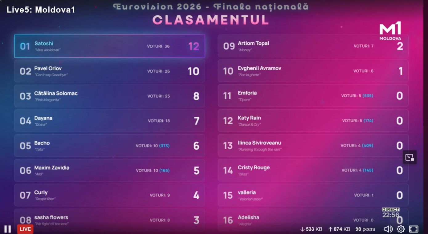Satoshi, with the song Viva Moldova, was the favorite of both the jury and the televote. Most of the 20 jury members awarded him 12 points. Pavel Orlov finished in second place with the song, Can’t Say Goodbye, and the top three was completed by Cătălina Solomac with the song Pink Margarita.