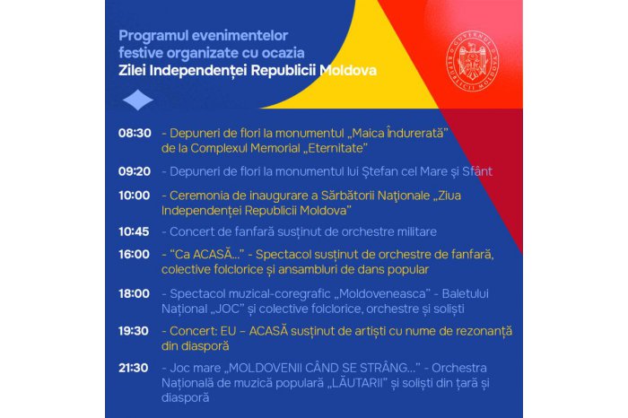 Chisinau, 25 August /MOLDPRES/ - Moldova’s government informs about the detailed schedule of celebrating the Independence Day on 27 August, due to be held on the Great National Assembly Square (PMAN), the government’s communication and protocol department has reported.