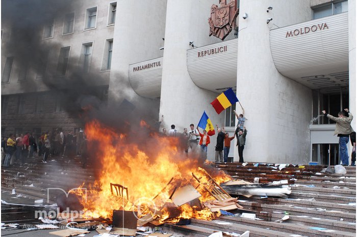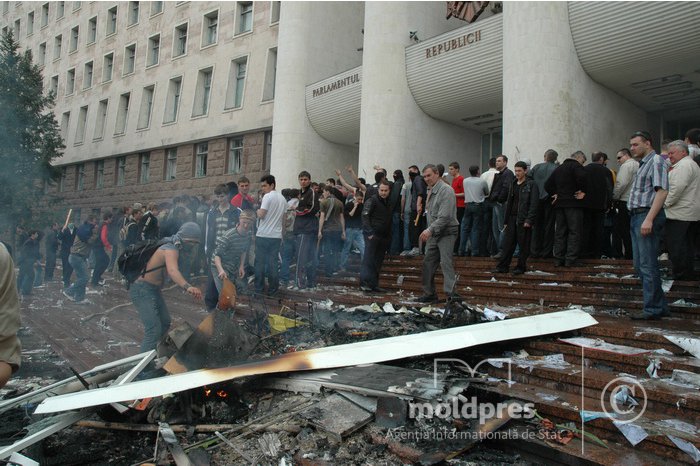 On April 7, around 10:00 a.m., more than 8,000 young people were protesting. Strangely, the central buildings of the state were guarded by young students of Stefan cel Mare Police Academy, who were obviously overwhelmed by the magnitude of the events. The opposition politicians were also overwhelmed by the situation. Vlad Filat, leader of the Liberal Democratic Party, made an attempt to redirect the crowd to PMAN, where microphones were installed, but without success. Soon stones started flying at the windows of the Presidency, and then of the Parliament. The law enforcement forces, after a simulation of action, practically withdrew and the destruction of the interior of the central institutions of the state by the protesters began. In a strange way, in the presence of some deputies from the government, the Romanian flag was hoisted on the Presidency building, which suggested that the real organizers wanted from the start to direct the suspicions to someone else. Next comes the destruction, looting and burning of the interior on the floors of both institutions. Among the first rooms set on fire is the Parliament archive. The constituent acts of the Republic of Moldova, the Declaration of Independence and the Constitution of the country were destroyed by burning, even if the metal safes were not even opened. These extremely dubious things have not been elucidated by the Moldovan judiciary even until today.