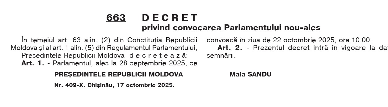 The decree on convening the new Parliament, elected on September 28, 2025, has been published in the Official Journal of the Republic of Moldova. The document is signed by President Maia Sandu and establishes that the first session of the Legislature will take place on 22 October 2025, at 10:00 AM.