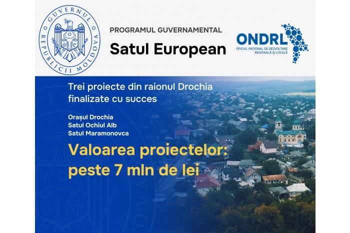 Chisinau, 31 Jan. /MOLDPRES/- Three projects worth over seven million lei (350 thousand euros), included in the European Village Program, were completed in Drochia district. As a result, several inhabitants of Drochia have access to the sewage system, the people of Ochiul Alb village have water at the taps, and the children of Maramonovca benefit from furniture and modern educational means.