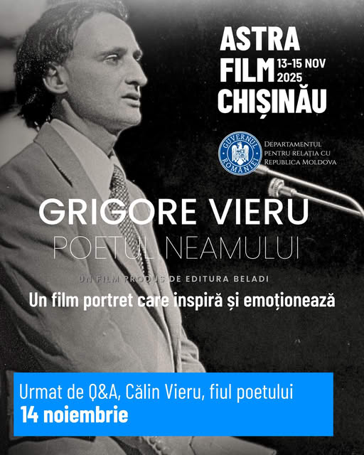 Vineri, 14 noiembrie, ora 17:00, la Cineplex Loteanu, sala 1, va fi proiectat filmul dedicat poetului Grigore Vieru, urmat de o sesiune Q&A cu Călin Vieru, fiul poetului. Prin imagini de arhivă și interviuri cu Călin Vieru, Tudor Gheorghe și alți apropiați, documentarul conturează un portret profund al celui care a transformat poezia în glasul identității românești.