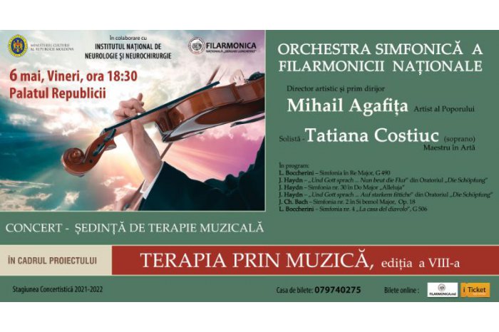 Vineri, 6 mai, la ora 18.30, Filarmonica Națională ”Serghei Lunchevici” împreună cu Institutul Național de Neurologie și Neurochirurgie își așteaptă publicul la Palatul Republicii la un concert-ședință din cadrul Proiectului ”Terapia prin muzică”, prin intermediul căruia organizatorii își propun să valorifice efectele muzicii asupra stării emoționale a ascultătorilor. Printre lucrările care vor fi interpretate se numără adevărate capodopere ale muzicii clasice universale. Partea terapiei prin muzică vocală va fi asigurată de soprana Tatiana Costiuc. La pupitrul dirijoral - maestrul Mihail Agafița, Artist al Poporului.