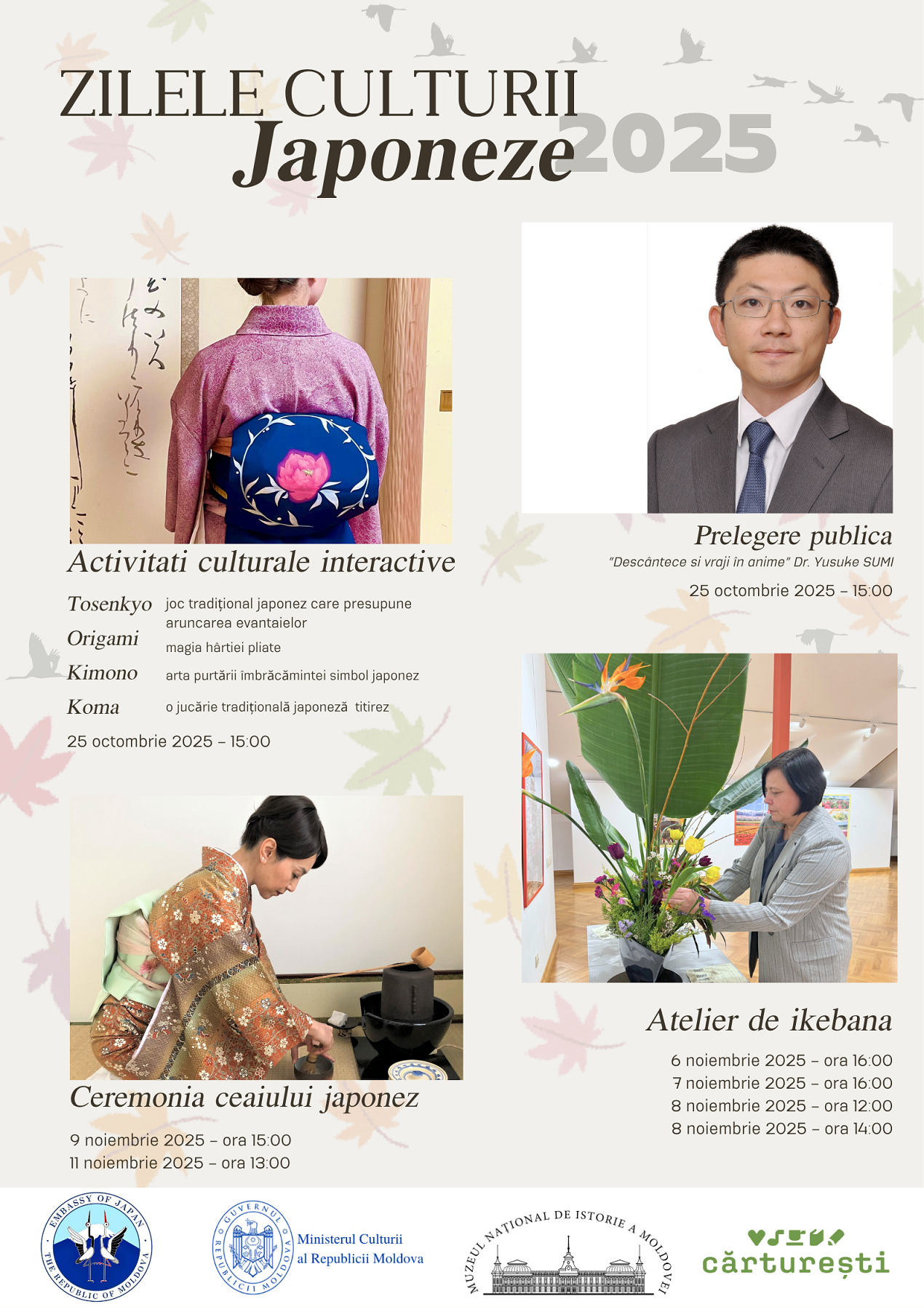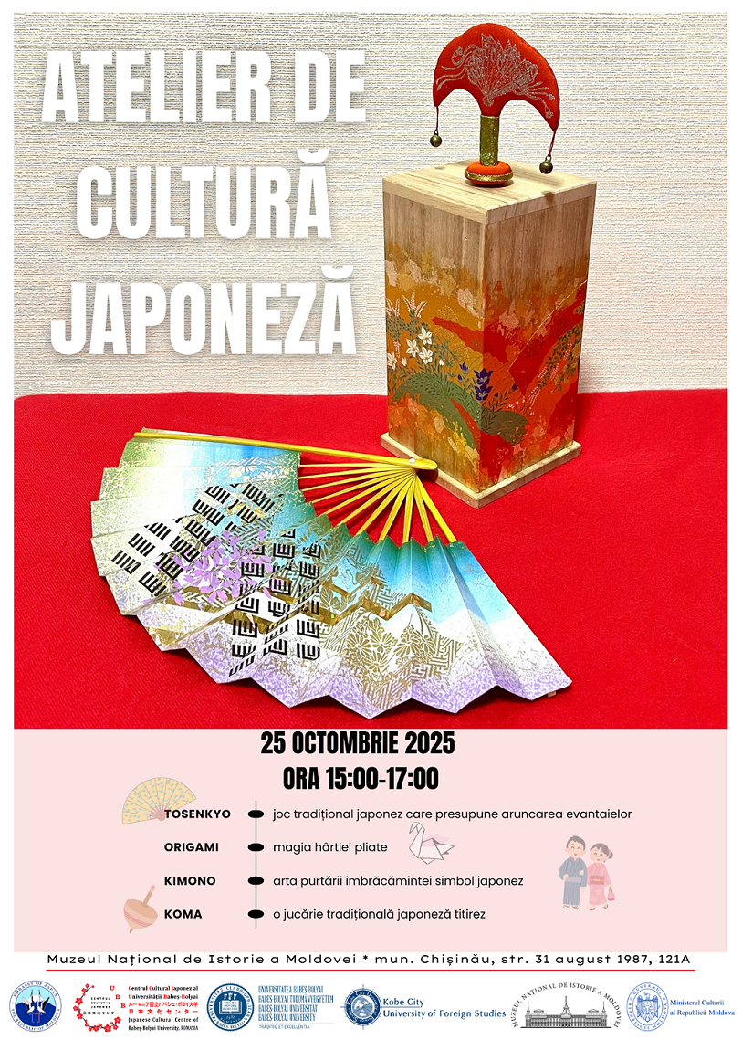 - Atelier de cultură japoneză – 25 octombrie, ora 15:00: jocul tradițional Tosenkyo, origami, arta de a purta kimono și titirezul Koma.