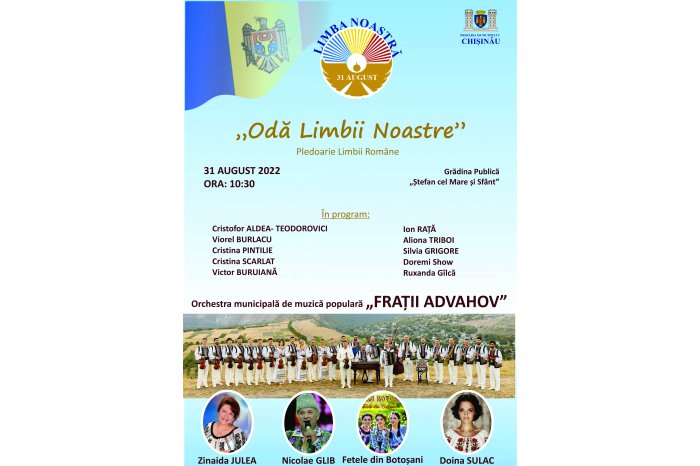 De la ora 10:30, în Grădina Publică ,,Ștefan cel Mare și Sfânt", va avea loc deschiderea oficială a programului muzical - literar, cu genericul „Odă Limbii Române", iar în cadrul evenimentului vor fi decernate diplome premianților tradiționalului concurs municipal „Dictare pentru fiecare", ediția a VI-a.