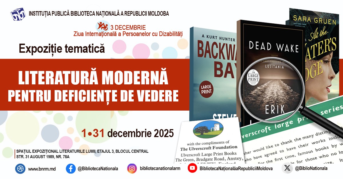 Biblioteca Națională a Republicii Moldova găzduiește, în contextul Zilei internaționale a persoanelor cu dizabilități, expoziția „Literatură modernă pentru persoane cu deficiențe de vedere”. Evenimentul le oferă vizitatorilor oportunitatea de a descoperi publicații tipărite cu caractere mari, destinate atât copiilor, cât și adulților cu vedere slabă, punând accent pe beletristică în limba engleză, informează MOLDPRES.