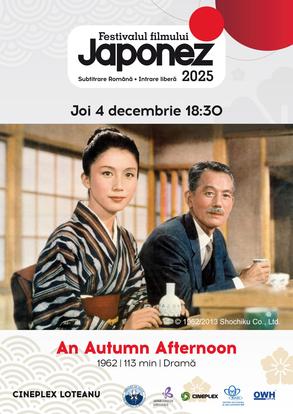 - Joi, 4 decembrie, ora 18:30 – „An Autumn Afternoon” (1962, 113 min, dramă), regia Yasujirō Ozu. Văduvul Hirayama își ajută fiica să-și urmeze propriul drum, reflectând asupra responsabilității părintești.