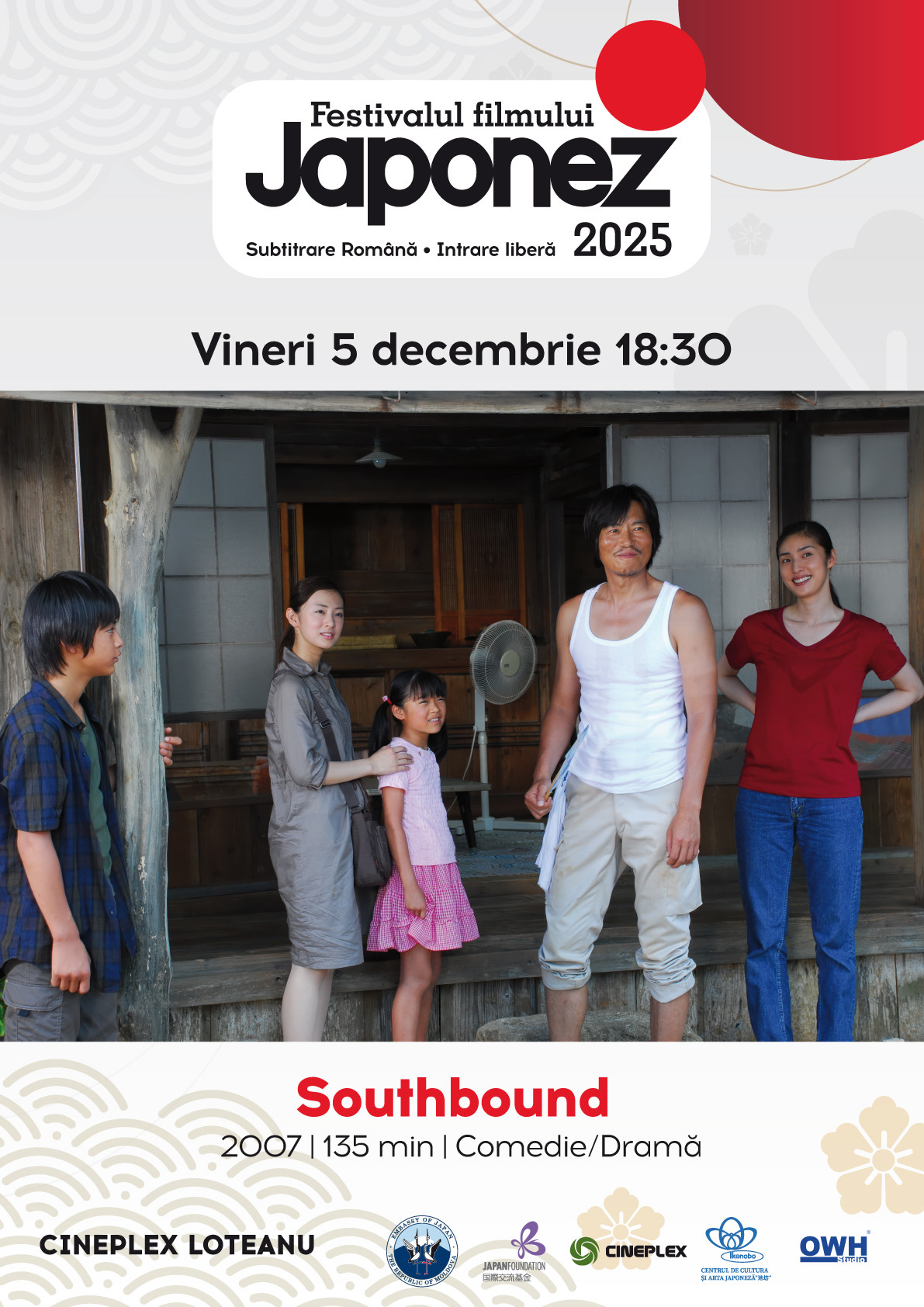 - Vineri, 5 decembrie, ora 18:30 – „Southbound” (2007, 114 min, comedie/dramă), regia Yoshimitsu Morita. O familie mutată pe o insulă izolată din Okinawa se confruntă cu conflicte locale neașteptate.