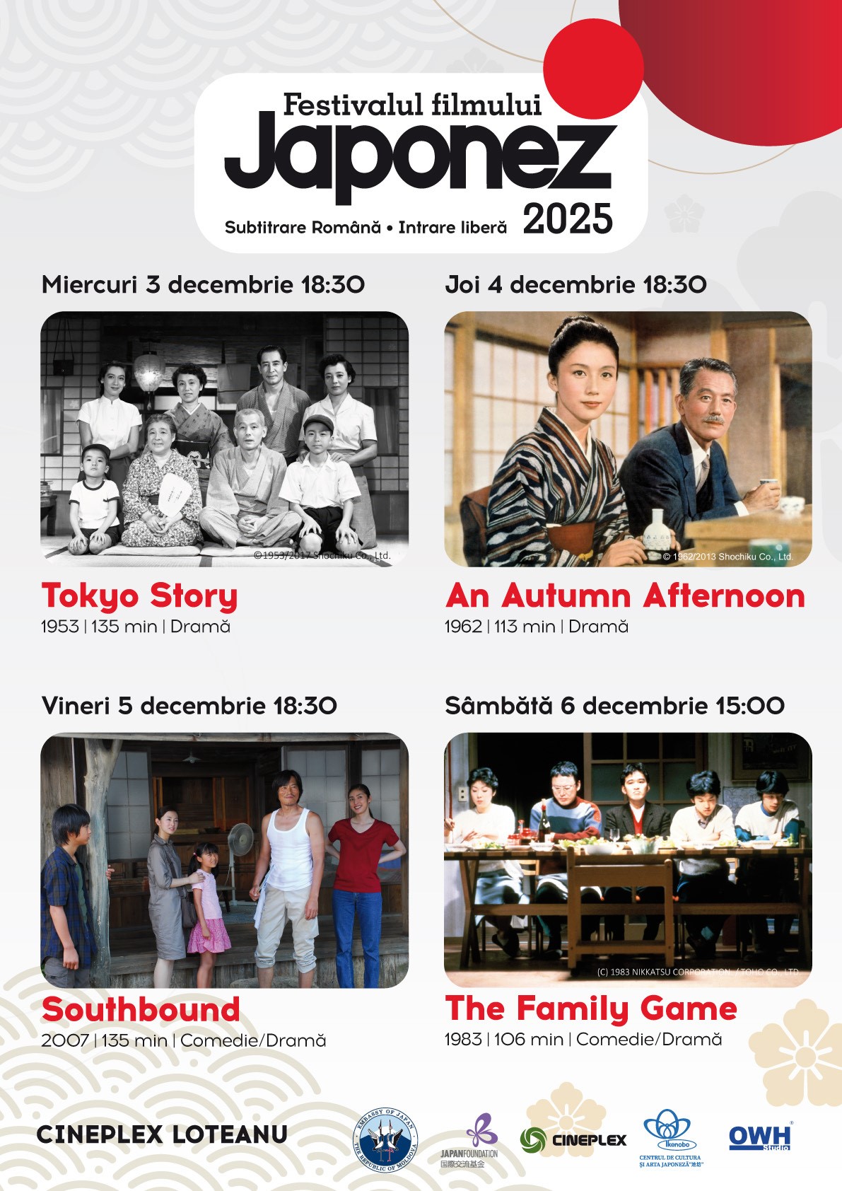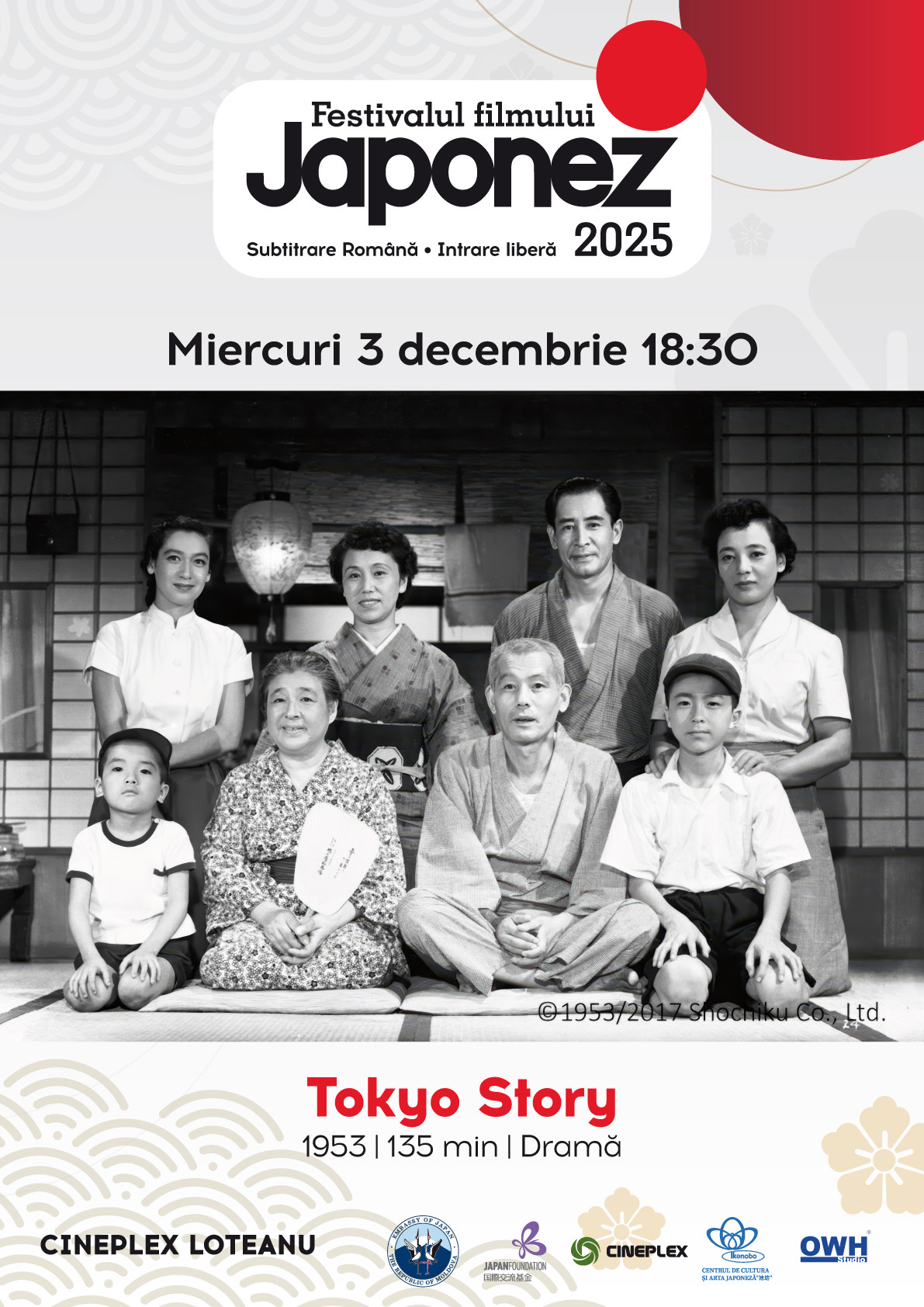 - Miercuri, 3 decembrie, ora 18:30 – „Tokyo Story” (1953, 135 min, dramă), regia Yasujirō Ozu. O poveste emoționantă despre legăturile familiale și trecerea timpului.