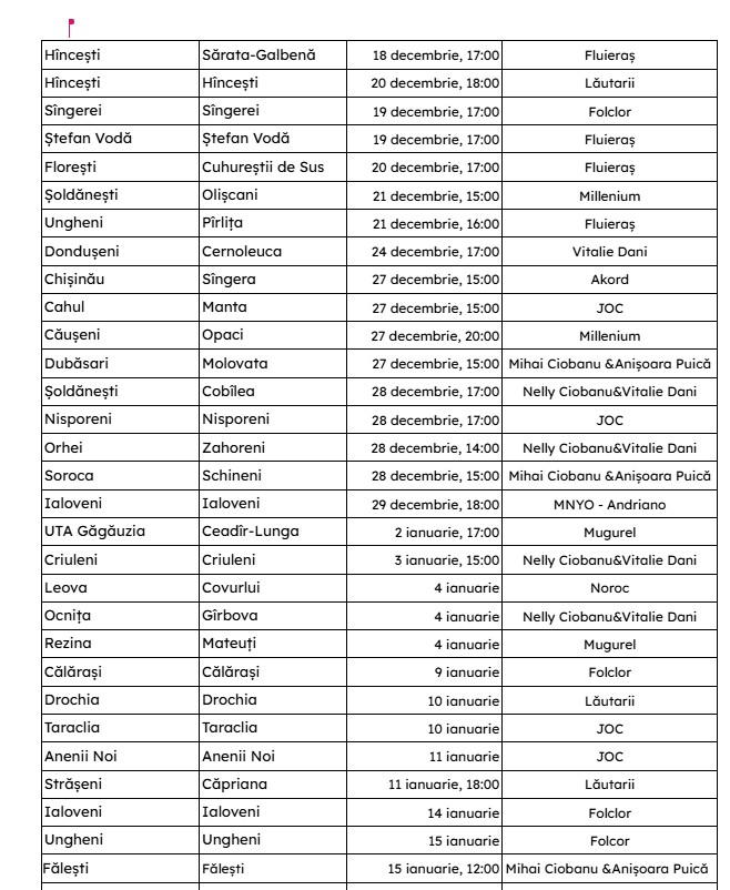 Astfel, pe 27 decembrie, ora 15.00, va avea loc un spectacol susținut de Mihai Ciobanu și Anișoara Puică în localitatea Molovata din Dubăsari. În aceeași zi, la Sângera, Chișinău, va concerta formația Akord. Tot atunci, locuitorii din Opaci, Căușeni, vor admira creația formației Millenium Band, iar la Manta, Cahul, va evolua Baletul național „Joc”.