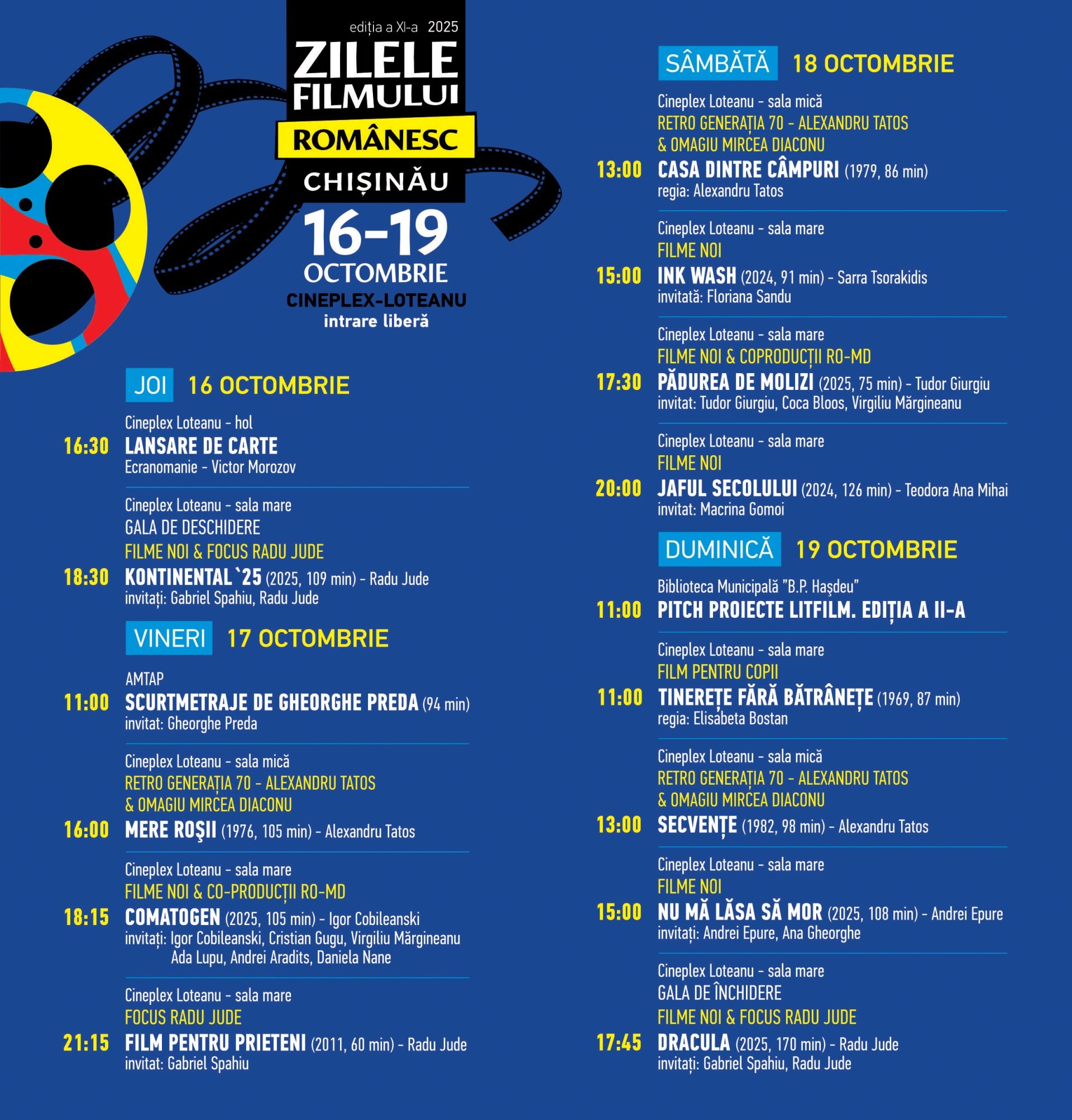 Cele mai apreciate filme noi, un focus dedicat regizorului Radu Jude, o retrospectivă Alexandru Tatos, un film pentru copii, o lansare de carte şi întâlniri cu invitaţi speciali, printre care cunoscuţii cineaşti Igor Cobileanski şi Tudor Giurgiu, fac parte din programul ediţiei a 11-a a Zilelor Filmului Românesc de la Chişinău, care are loc de joi până duminică la Cinematograful Cineplex-Loteanu.