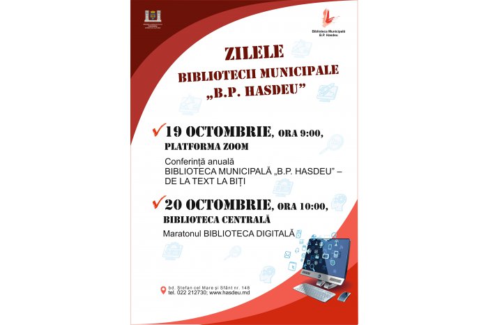 În dimineața zilei de astăzi, participanții din Republica Moldova, precum și de la instituțiile-partenere din România s-au reunit la Conferința anuală „Biblioteca municipală «B. P. Hasdeu» – de la text la biți”, care s-a desfășurat, în format online. În cea de-a doua zi a Zilelor Bibliotecii municipale „B. P. Hasdeu”, va fi organizat Maratonul „Biblioteca digitală”, care va începe la ora 10.00 la sediul central al instituției.