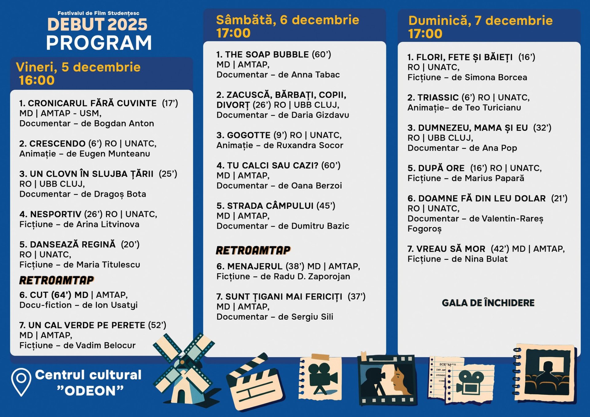 Programul include atât filme noi, cât și secțiunea RETROAMTAP, care readuce în atenție producții marcante ale Academiei de Muzică, Teatru și Arte Plastice din Chișinău. Festivalul oferă astfel o panoramă a talentului emergent și creează o platformă de dialog între tinerii cineaști din Moldova și România.