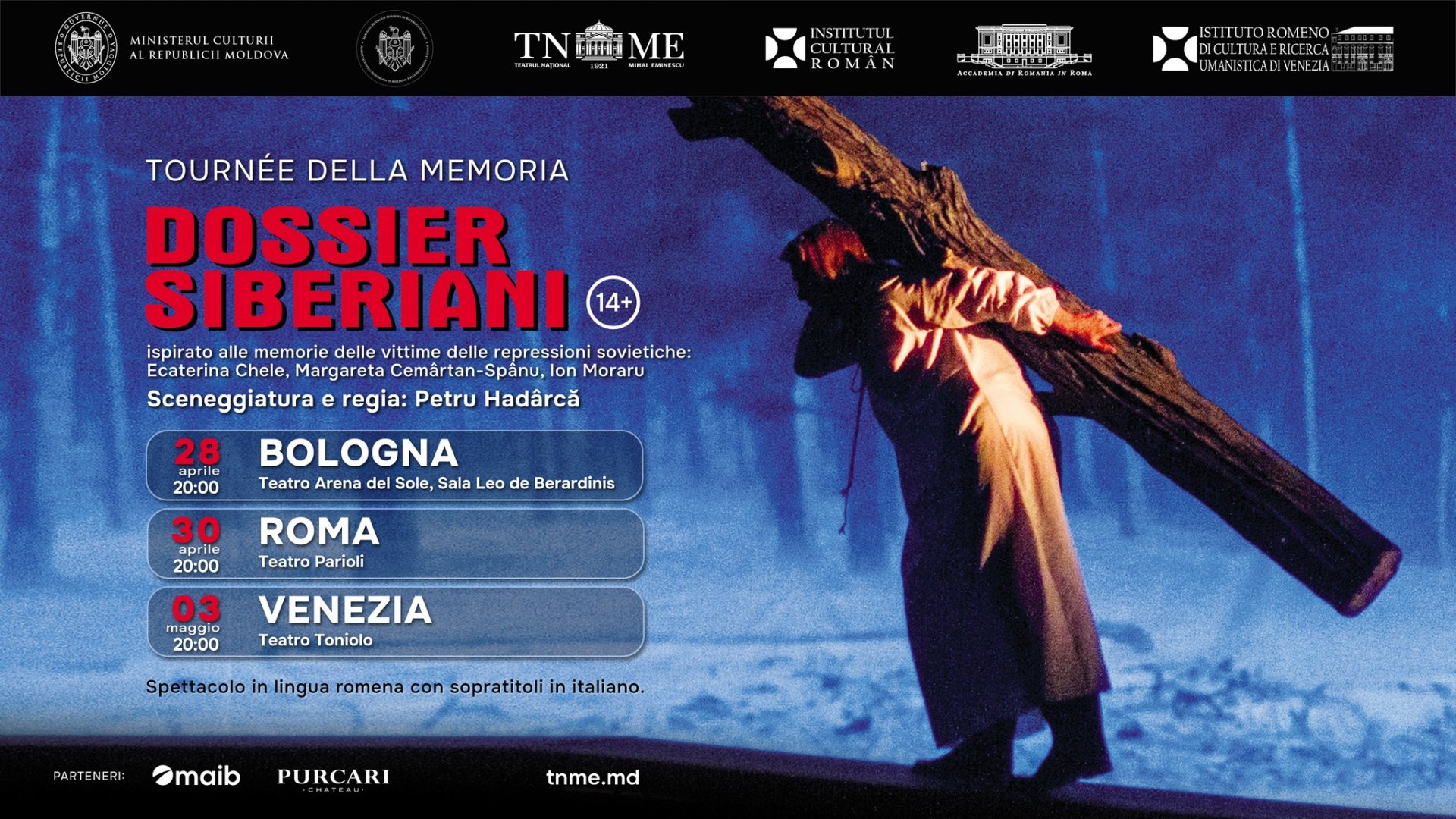 Teatrul Național „Mihai Eminescu” din Chișinău susține, în perioada 28 aprilie – 3 mai 2026, un turneu în Italia cu spectacolul „Dosarele Siberiei”, o producție dedicată memoriei istorice a Republicii Moldova în perioada regimului sovietic, transmite MOLDPRES.
