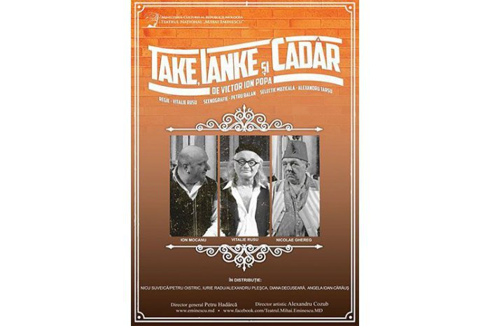 Astfel, mâine, începând cu ora 18.00, Teatrul Național ”Mihai Eminescu” va oferi publicului online spectacolul ”Take, Ianke și Cadâr” de Victor Ion Popa, în regia lui Vitalie Rusu. Potrivit organizatorilor, spectacolul readuce în scenă una dintre cele mai populare şi longevive piese clasice din dramaturgia românească, în care actorul are posibilitatea de a se descoperi, a se întrece pe sine însuși. Un spectacol cu umor irezistibil despre trei bătrâni puși mereu pe șotii, doi tineri îndrăgostiți, multe mofturi de mahala în toată splendoarea lor, dar și despre toleranță, prietenie și compasiune.