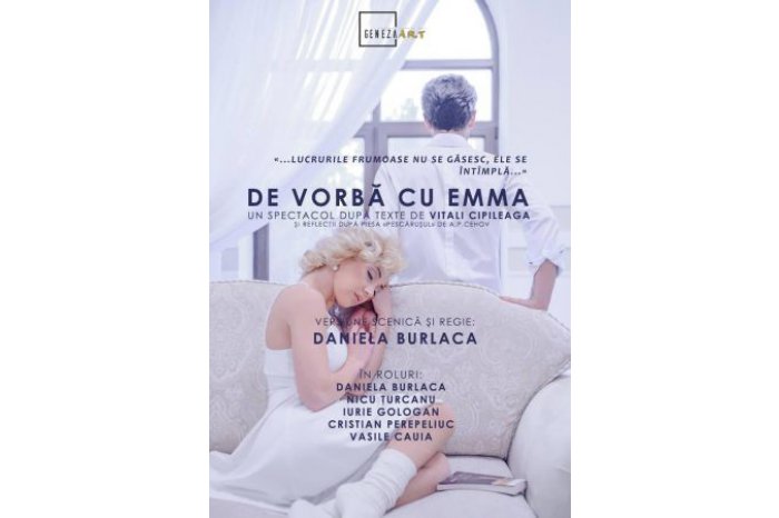 În aceeași zi, la ora 19.00, la Teatrul ”Geneza Art” va avea loc spectacolul ”De vorbă cu Emma”, după textele lui Vitali Cipileaga, cu accente din piesa ”Pescărușul” de A. P. Cehov, în regia Danielei Burlaca.