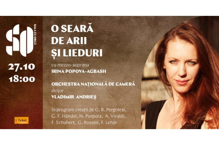 Joi, 27 octombrie, la 18.00, la Sala cu Orgă va susține un recital de arii și lieduri solista Irina Popova-Agbash, mezzo-soprană din Austria. Ea va fi acompaniată de Orchestra Națională de Cameră, dirijor Vladimir Andrieș. În program creații de G.B Pergolesi, G.F. Handel, N. Porpora; A. Vivaldi, F. Shubert, G. Rossini, F. Lehar.