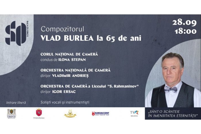 Mâine, 28 septembrie, la 18.00, la Sala cu Orgă va avea loc serata de creație a compozitorului Vlad Burlea, la 65 de ani de la naștere. Vor participa: Orchestra Națională de Cameră, Corul Național de Cameră, dirijor – Vladimir Andrieș, soliști vocali și instrumentiști. Intrarea este liberă.