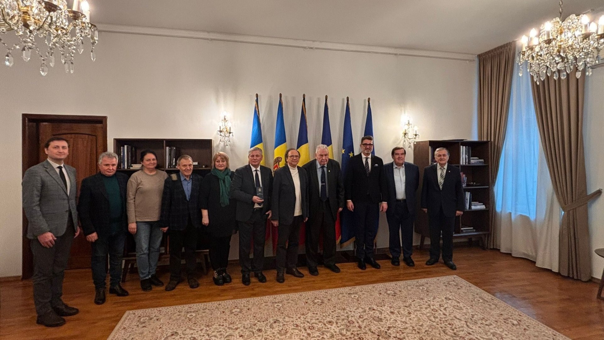 „Sunt deosebit de onorat să găzduiesc această ceremonie oficială de înmânare a decorației conferite de președintele României Uniunii Scriitorilor din Republica Moldova”, a declarat ambasadorul român.