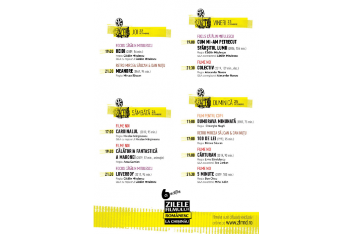 Chişinău, 22 oct. /MOLDPRES/. Unsprezece lungmetraje vor putea fi văzute în cadrul celei de-a șasea ediție a Zilelor Filmului Românesc (ZFR) din R. Moldova, care se va desfășura online în perioada 22-25 octombrie, informează MOLDPRES.