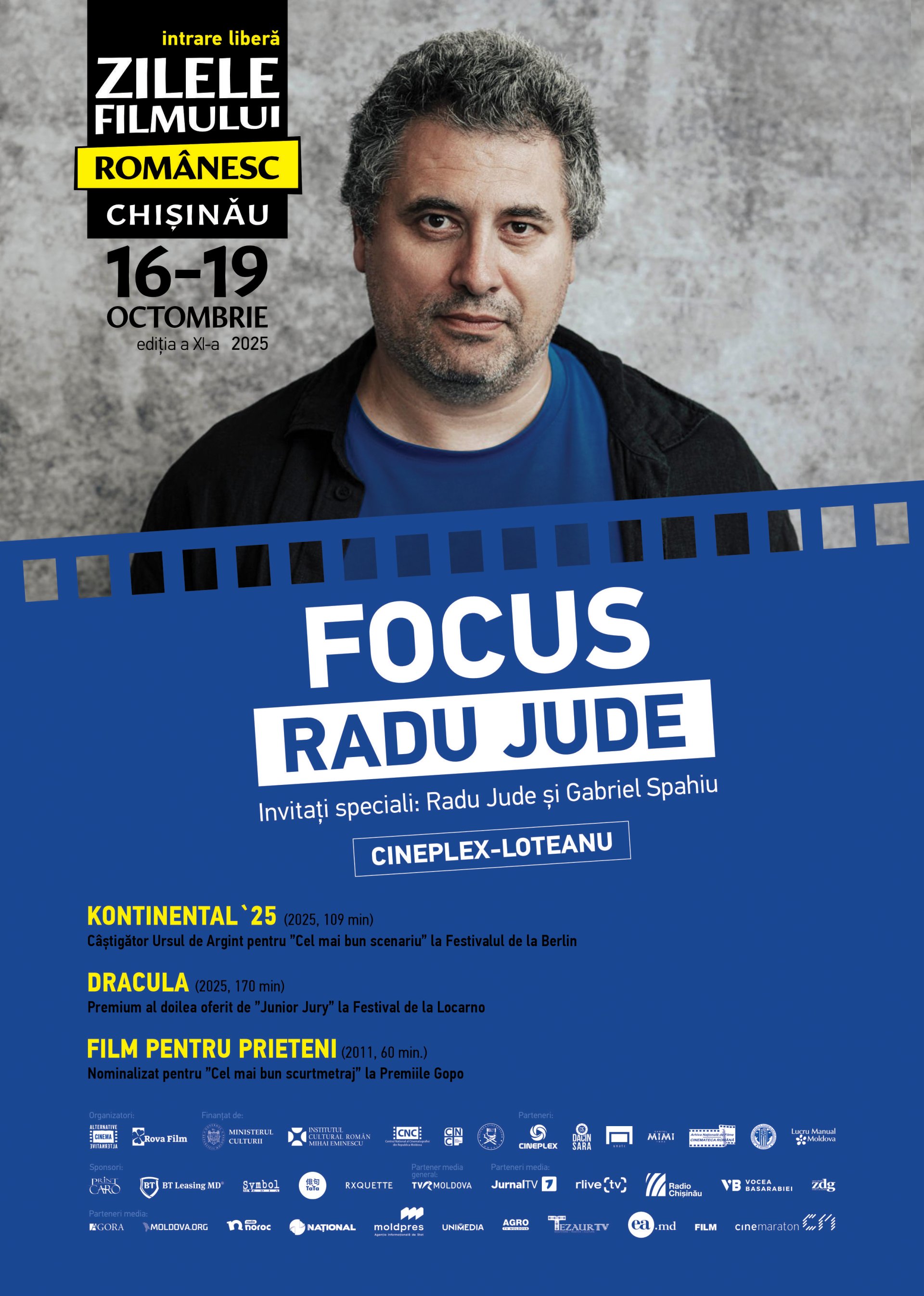 Zilele Filmului Românesc /ZFR/ la Chișinău, ajunse la cea de-a XI-a ediție, vor avea loc între 16 și 19 octombrie la Cineplex „Loteanu”, aducând în prim-plan creația unuia dintre cei mai apreciați cineaști contemporani, Radu Jude, printr-o secțiune specială FOCUS dedicată regizorului. Intrarea la proiecții este gratuită, cu rezervarea prealabilă a biletelor la casieria cinematografului, în zilele premergătoare proiecțiilor, informează MOLDPRES.
