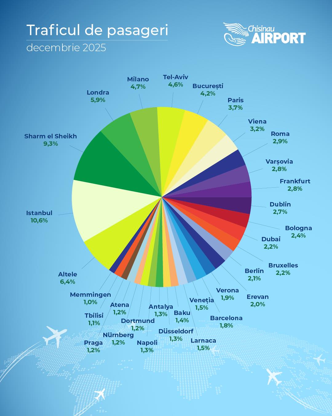 Potrivit sursei citate, destinațiile noi introduse în rețeaua de zboruri au atras, doar în luna decembrie, 59.397 de pasageri, ceea ce reprezintă 9,52% din totalul traficului lunar, confirmând interesul tot mai mare pentru conexiuni aeriene diversificate.