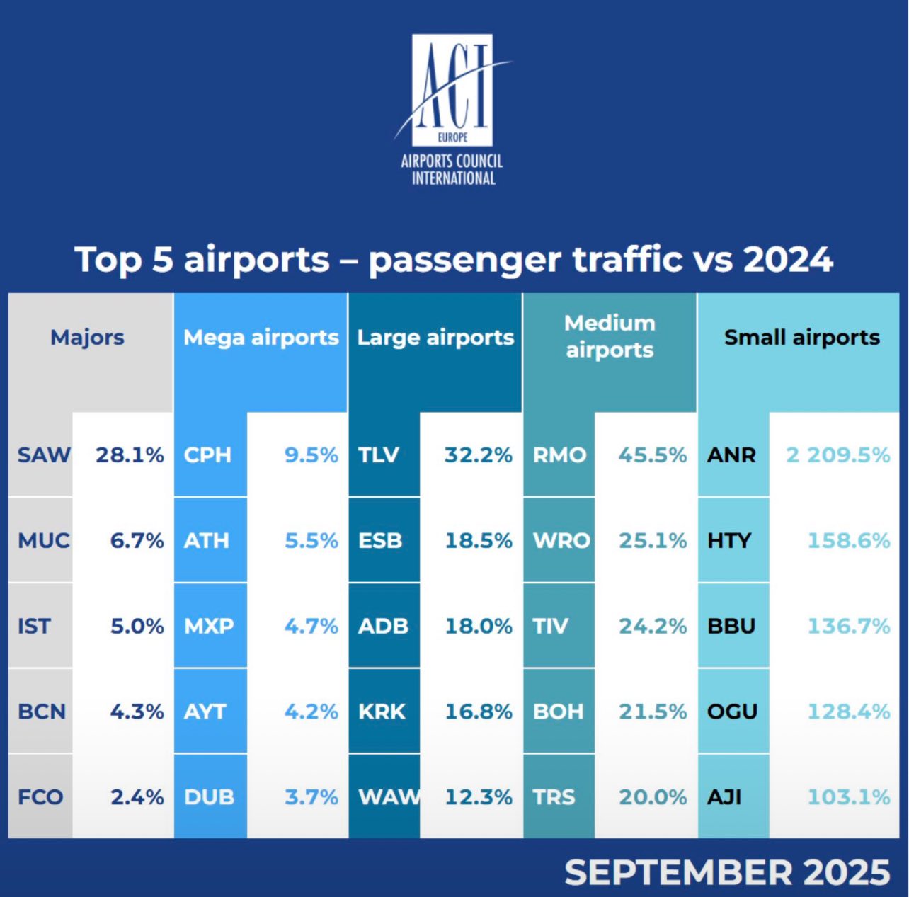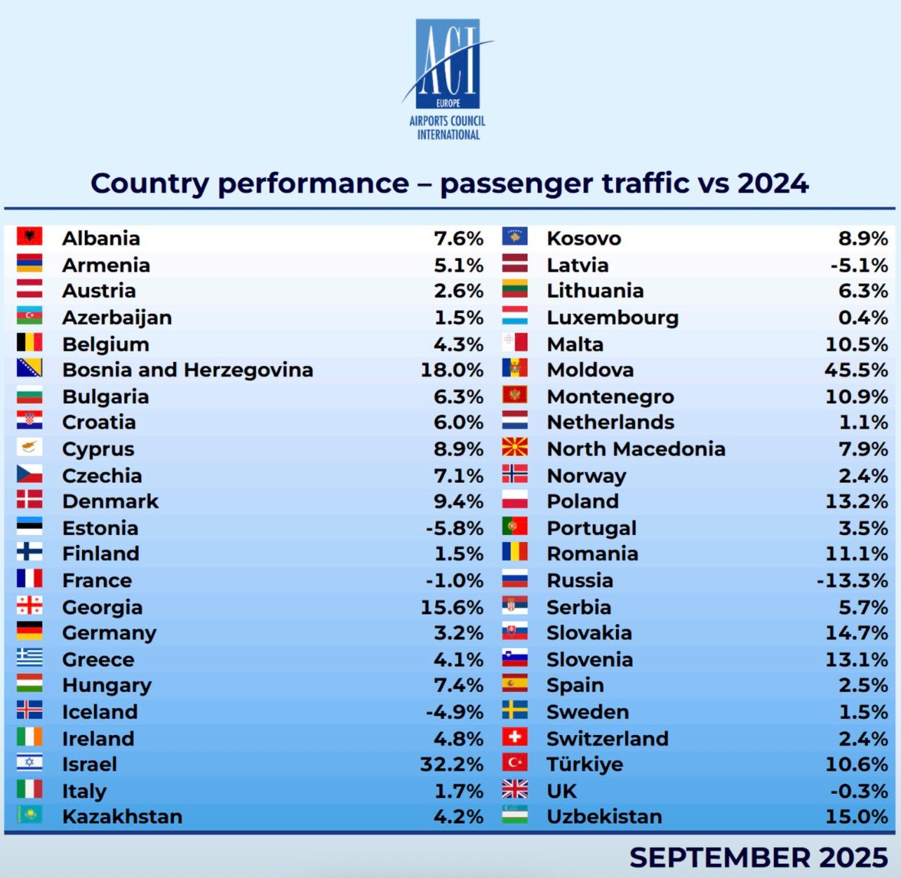 Aeroportul Internațional „Eugen Doga” – Chișinău a fost desemnat lider european în categoria aeroporturilor de dimensiune medie la creșterea traficului de pasageri în luna septembrie 2025, potrivit celui mai recent raport publicat de ACI EUROPE (Airports Council International Europe), transmite MOLDPRES.