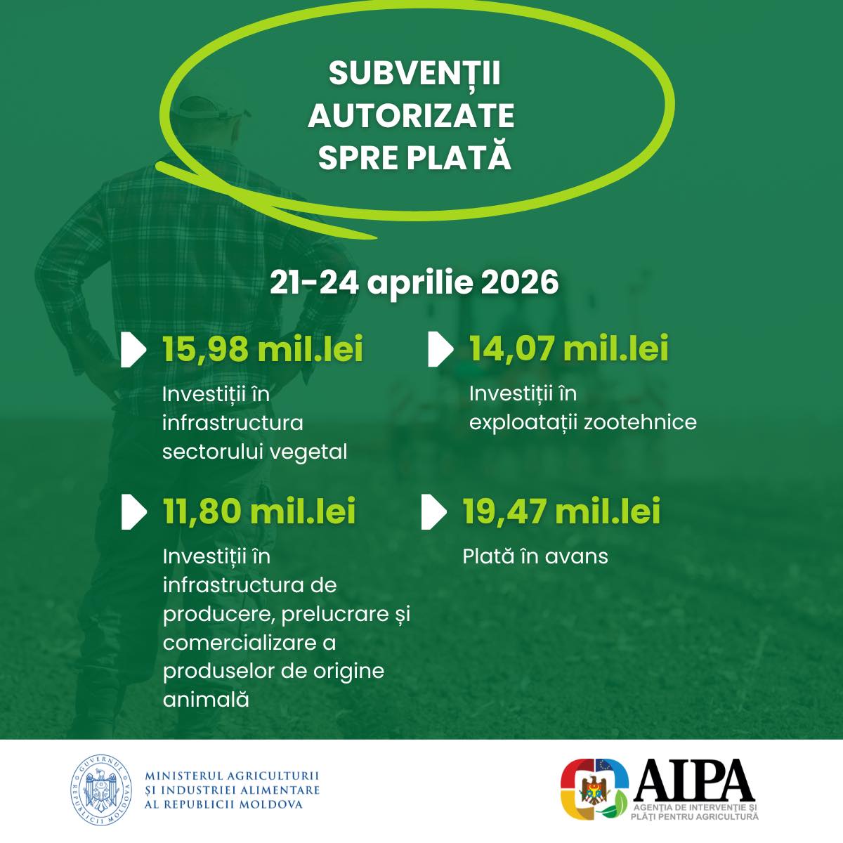 Ministerul Agriculturii și Industriei Alimentare (MAIA) anunță o nouă etapă de finanțare pentru producătorii agricoli din Republica Moldova. Astfel, în perioada 21-24 aprilie 2026, Agenția de Intervenție și Plăți pentru Agricultură (AIPA) a autorizat spre plată subvenții în valoare totală de 77,85 milioane de lei, fonduri menite să susțină modernizarea sectorului rural și dezvoltarea afacerilor zootehnice și vegetale, transmite MOLDPRES.