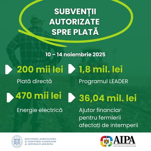 Agenția de Intervenție și Plăți pentru Agricultură (AIPA) a autorizat, în perioada 10–14 noiembrie 2025, plăți în valoare totală de 40,3 milioane de lei, destinate susținerii producătorilor agricoli și implementării programelor de dezvoltare rurală, transmite MOLDPRES.