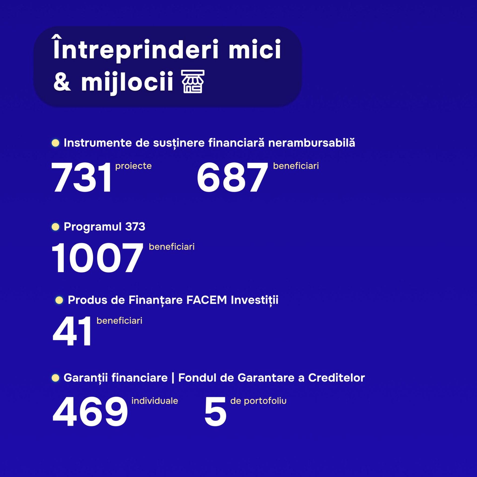 Sprijinirea întreprinderilor mici și mijlocii a rămas o prioritate majoră pentru MDED. Prin programele gestionate de Organizația pentru Dezvoltarea Antreprenoriatului, peste 400 de proiecte au beneficiat de finanțare, iar resursele mobilizate în economie au depășit 4,3 miliarde de lei. Numărul beneficiarilor de granturi s-a dublat, iar măsurile de dereglementare adoptate au redus semnificativ povara administrativă pentru mediul de afaceri.