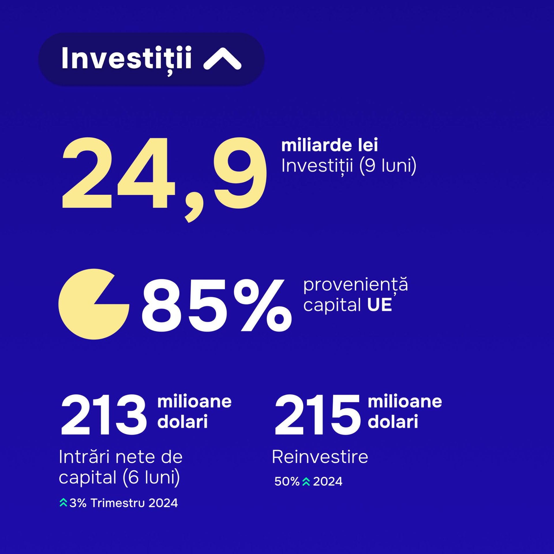 Datele MDED relevă că investițiile au reprezentat principalul motor al creșterii, formarea brută de capital fix înregistrând un avans de aproape 18% în trimestrul III. În domeniul investițiilor, anul 2025 a fost caracterizat de revenirea investițiilor străine directe pe un trend ascendent. Intrările nete de capital au depășit 213 milioane de dolari în prima jumătate a anului, iar reinvestirea profiturilor a crescut cu peste 50%. Uniunea Europeană rămâne principalul partener investițional, cu peste 85% din capitalul străin provenind din state membre UE.