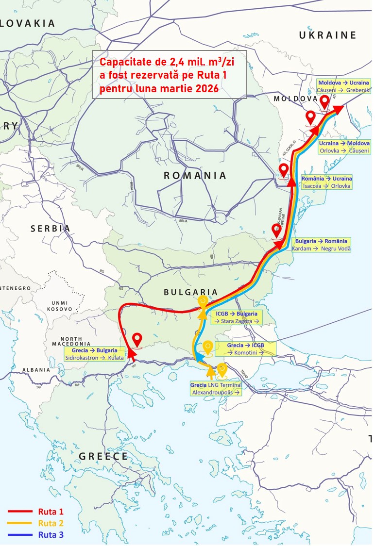 O capacitate record de transport a gazelor naturale, în cuantum de 25 500 MWh/zi/lună, echivalentul a 2,4 milioane m3/zi, a fost rezervată pe Coridorul vertical, Ruta 1, începând cu luna martie 2026. Ruta 1, parte a gazoductului transbalcanic în regim revers fizic, este destinată transportării gazelor naturale de la terminalele LNG din Grecia, inclusiv gaze naturale lichefiate din Statele Unite ale Americii, către depozitele de stocare subterane din Ucraina, informează MOLDPRES.