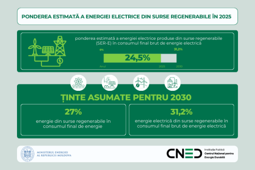 Conform datelor statistice, Republica Moldova a înregistrat, în ultimii cinci ani, o creștere de 12 ori a capacităților instalate de energie electrică din surse regenerabile - de la 77,37 MW în 2020, la aproape 1 000 MW la începutul anului curent. Doar pe parcursul anului 2025, s-au instalat peste 400 MW, reprezentând mai mult de 40% din totalul capacităților existente și marcând un an record pentru tranziția energetică a țării.