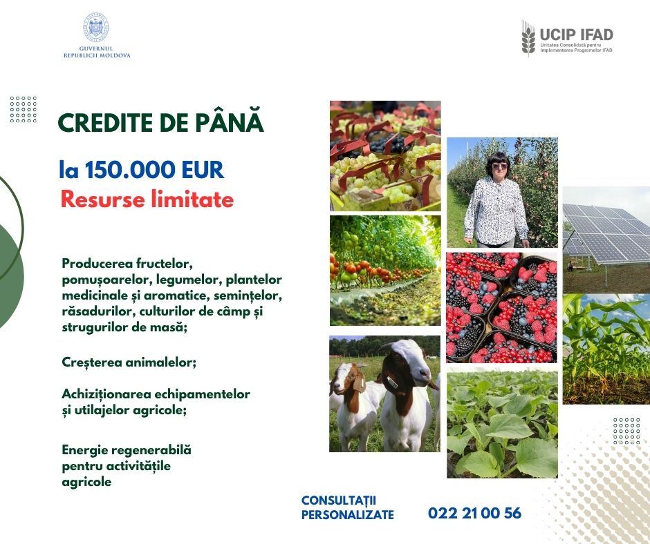 Tinerii fermieri și femeile antreprenoare din mediul rural pot accesa credite în valoare de până la 150.000 de euro pentru dezvoltarea activităților de producere, în cadrul unor programe de finanțare susținute de Fondul Internațional pentru Dezvoltarea Agricolă (IFAD), transmite MOLDPRES.