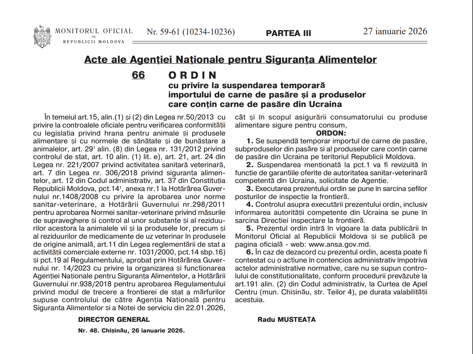 Decizia Agenției Naționale pentru Siguranța Alimentelor (ANSA) privind suspendarea importului de carne de pasăre din Ucraina, a fost publicată în Monitorul Oficial, informează MOLDPRES.