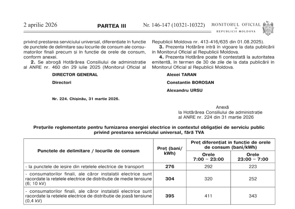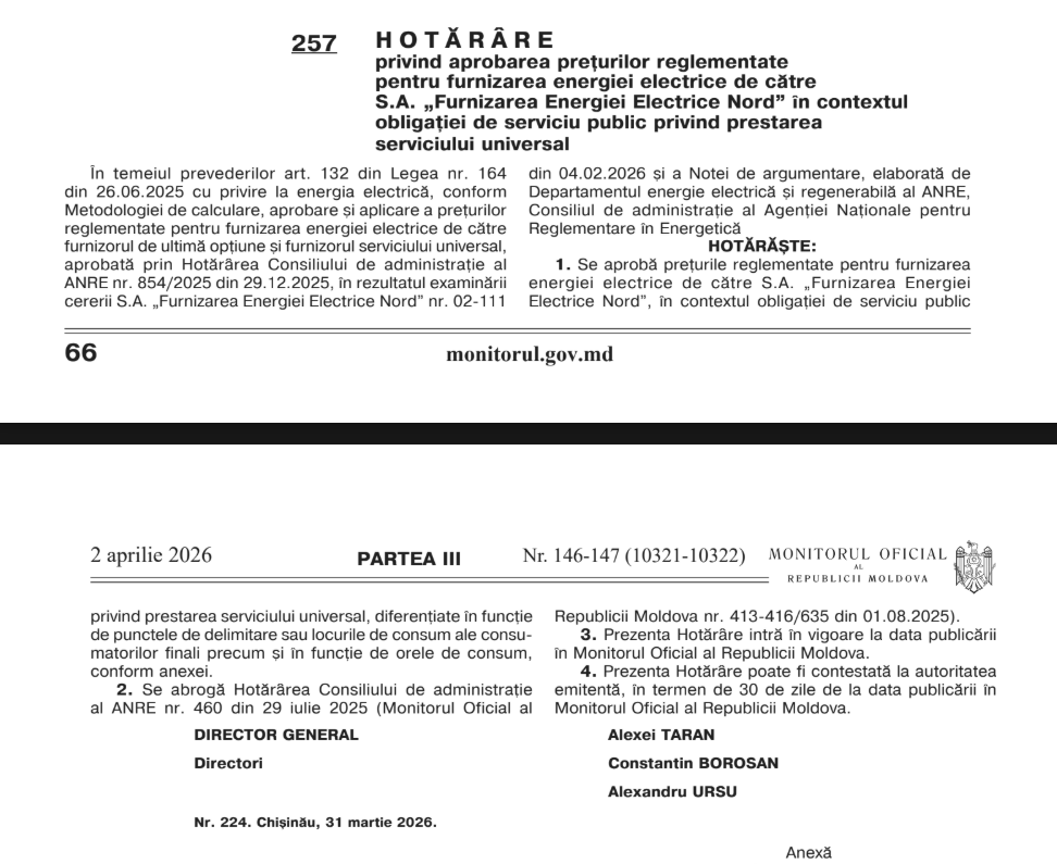 Astfel, consumatorii din nordul țării, deserviți de S.A. „Furnizarea Energiei Electrice Nord”, vor achita un preț de 3 lei și 95 de bani per kWh, cu cinci bani mai puțin decât în prezent.