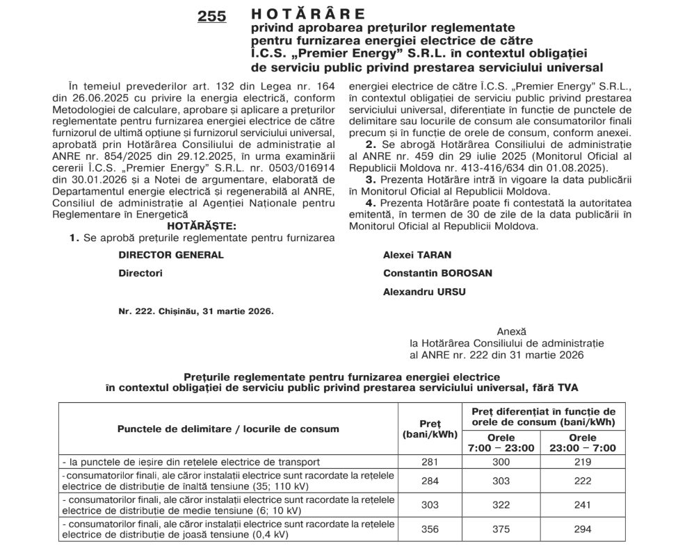 ANRE a ieftinit energia electrică pentru consumatorii Premier Energy și FEE Nord. Noile tarife, în vigoare din aprilie