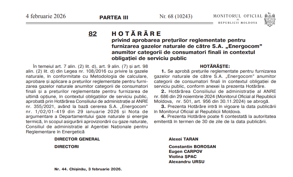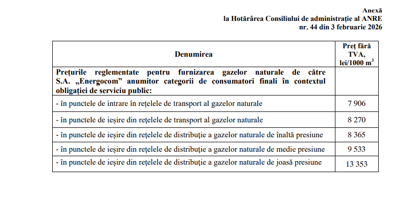 Totodată, la stabilirea prețurilor, ANRE a inclus corecții din excedentele tarifare de la începutul anului 2026, în valoare totală de peste 330 milioane lei. Aceste sume sunt restituite consumatorilor prin diminuarea prețurilor reglementate aplicabile în perioada februarie–decembrie 2026.
