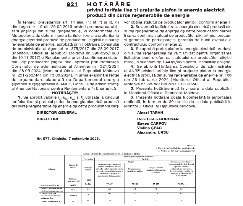 Hotărârea Agenției Naționale pentru Reglementare în Energetică (ANRE) privind aplicarea noilor tarife fixe și prețuri plafon pentru energia electrică din surse regenerabile a fost publicată astăzi în Monitorul Oficial, informează MOLDPRES.
