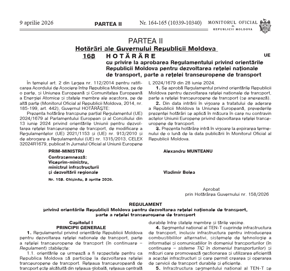 Noile prevederi au fost incluse în Regulamentul privind orientările Republicii Moldova pentru dezvoltarea rețelei naționale de transport, parte a rețelei transeuropene de transport, care a fost publicat astăzi în Monitorul Oficial.