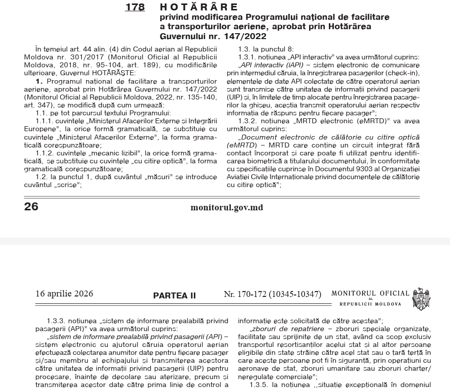Republica Moldova a actualizat Programul național de facilitare a transporturilor aeriene, pentru proceduri simplificate de administrare a transportului aerian, sporirea securității și eficientizarea schimbului de informații privind pasagerii. Documentul a fost publica astăzi în Monitorul Oficial, transmite MOLDPRES.