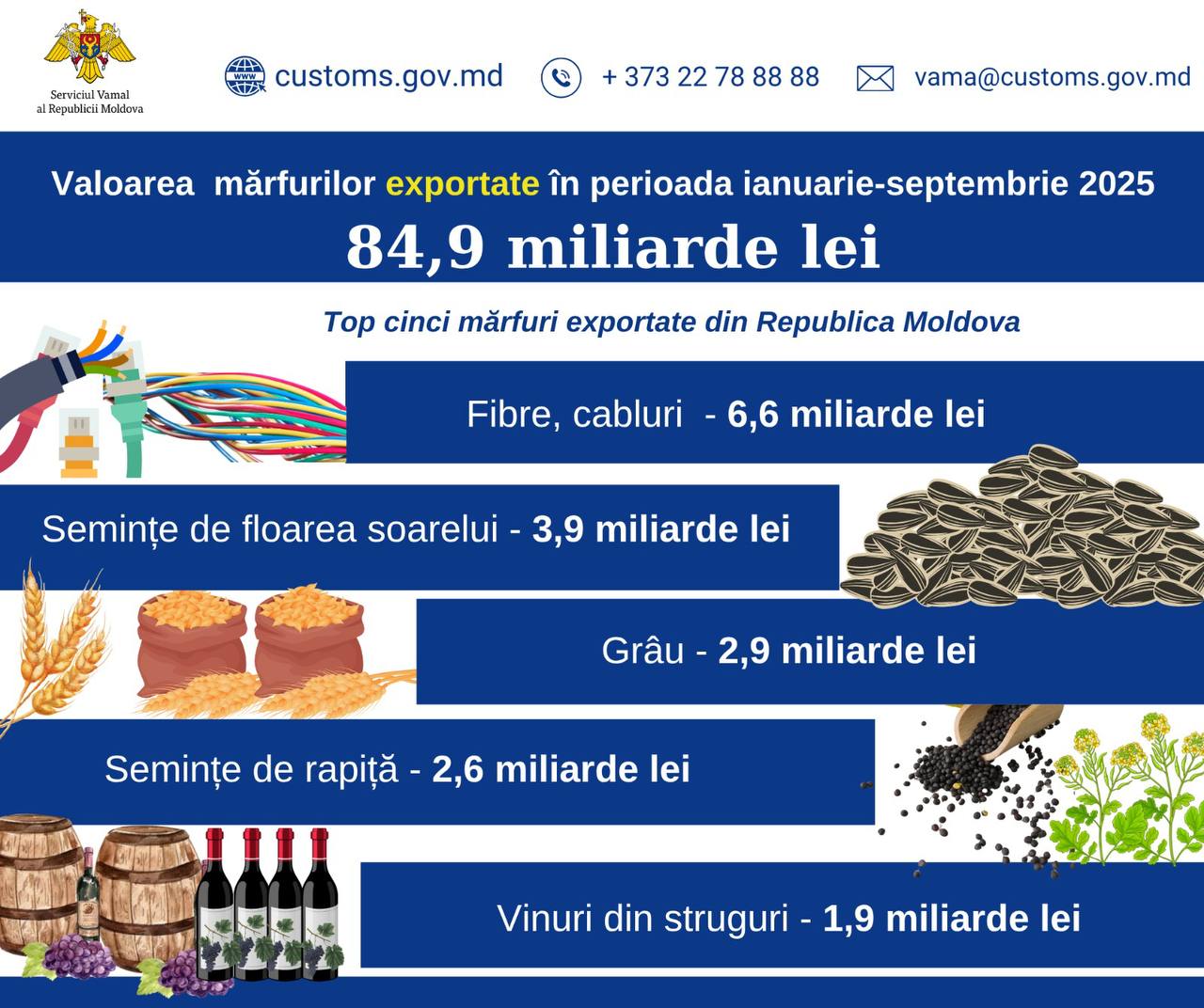 În topul mărfurilor exportate se regăsesc fibre și cabluri (6,6 miliarde de lei), semințe de floarea soarelui (3,9 miliarde de lei) și grâu (2,9 miliarde de lei).