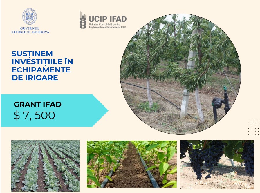Un număr de 26 de fermieri din Republica Moldova vor beneficia de granturi pentru procurarea echipamentelor de irigare, în cadrul programelor implementate de Ministerul Agriculturii și Industriei Alimentare, prin UCIP IFAD Moldova, cu sprijinul Fondului Internațional pentru Dezvoltarea Agricolă, transmite MOLDPRES.