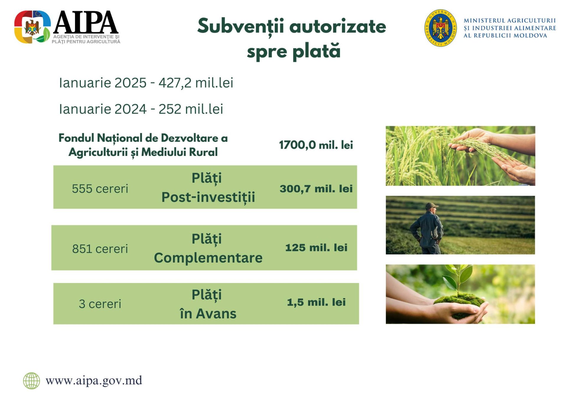În ianuarie 2025, AIPA a autorizat spre plată 427,2 milioane de lei sub formă de subvenții pentru fermieri