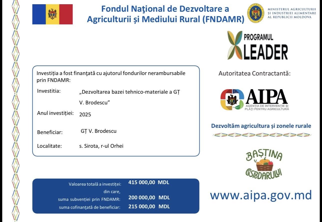 Un exemplu concret este proiectul „Dezvoltarea bazei tehnico–materiale” al GT V. Brodescu din satul Sirota, raionul Orhei. Proiectul a fost implementat cu sprijinul Programului LEADER, din fondurile FNDAMR (Fondul Național pentru Dezvoltare Agricolă și Rurală), administrate de Agenția de Intervenție și Plăți pentru Agricultură (AIPA), iar investițiile totale au fost de 415.000 lei, dintre care 215.000 lei reprezintă contribuția proprie a beneficiarului.