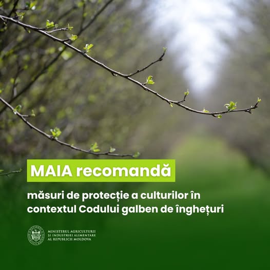 Ministerul Agriculturii și Industriei Alimentare (MAIA) a lansat un apel urgent către producătorii agricoli din nordul și centrul țării, în contextul avertizării de Cod Galben de înghețuri emisă pentru perioada 29–30 aprilie. Autoritățile avertizează că temperaturile nocturne ce pot coborî până la –3°C reprezintă un risc major pentru culturile aflate în plin proces de vegetație, transmite MOLDPRES.