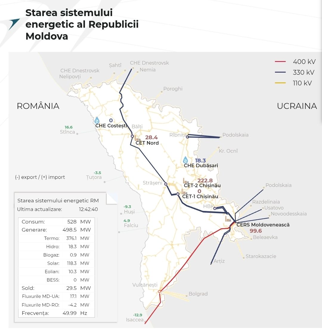 Potrivit operatorului sistemului de transport, Moldelectrica, la acea oră erau importați doar 29,5 MW de energie electrică prin cele patru linii de 110 kV, activate în regim insular cu sistemul energetic românesc.